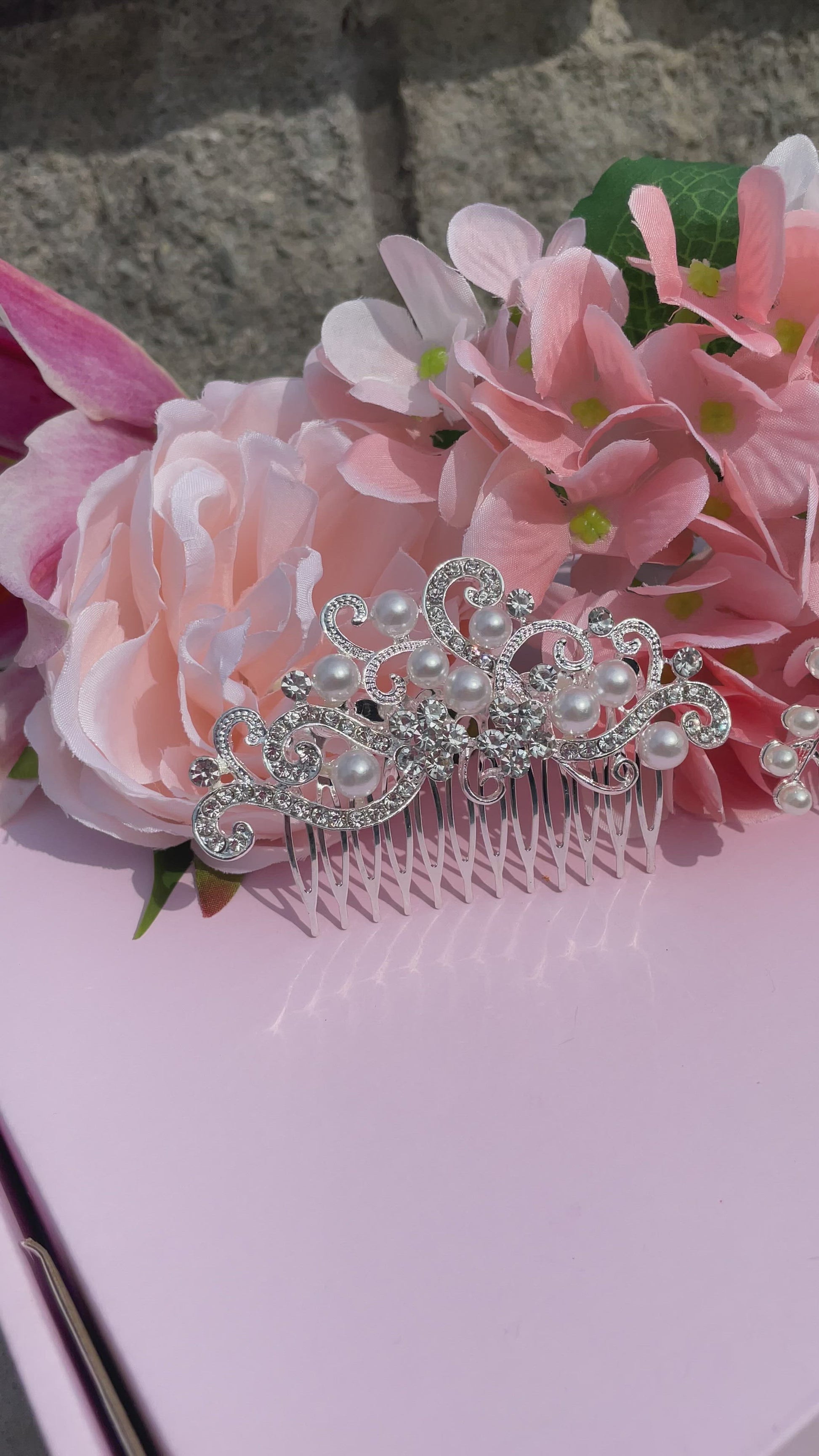 This glitzy hair comb is a classic. It has pearls and amazing sparkle. Perfect for a bridal upstyle. This is on a sturdy hair comb and is lightweight.